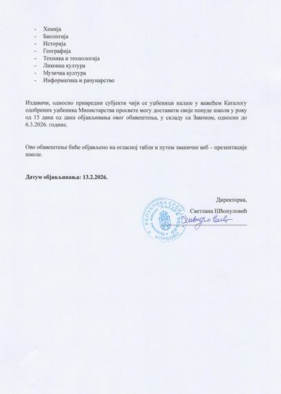Обавештење о спровођењу избора уџбеникаДатум: 13. Februar 2026 14:14 Категорија: Новости |